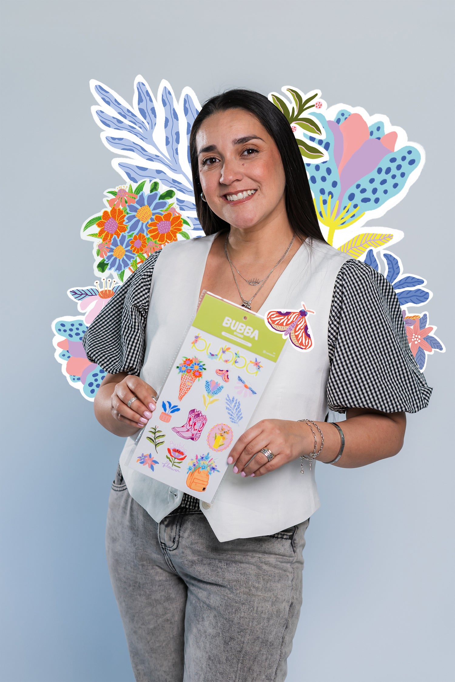 Cada diseño nace desde mi universo ilustrado: flores, formas orgánicas y trazos que inspiran calma, belleza y conexión. Verlos junto al espíritu libre y aventurero de Bubba fue un proceso precioso, donde cada sticker se transformó en una pequeña pieza de arte para llevar contigo.